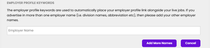Note: If the Employer uses various employer names, more than one name can be added. For example: If the Employer Profile is for Australian Broadcasting Corporation (ABC). Both “ABC” and “Australian Broadcasting Corporation” can be added so that the Employer Profile is linked to jobs for each variation of the Employer’s name.